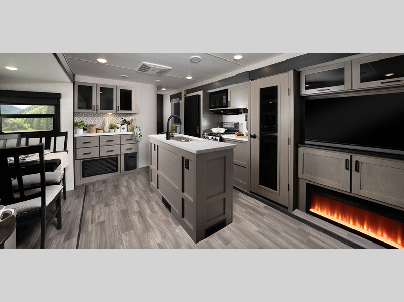 Sleeps 5 Slides 2 Length 33 ft 5 in Ext Width 8 ft 1 in Ext Height 11 ft 2 in Int Height 6 ft 9 in Interior Color Washed Driftwood Hitch Weight 960 lbs GVWR 8900 lbs Dry Weight 7320 lbs Cargo Capacity 1580 lbs Fresh Water Capacity 45 gals Grey Water Capacity 58 gals Black Water Capacity 29 gals Tire Size ST225/75R15E Furnace BTU 30000 btu Available Beds King Refrigerator Type 12 Volt Refrigerator Size 10 cu ft Cooktop Burners 3 Number of Awnings 2 LP Tank Capacity 30 lbs Water Heater Capacity 6 gal Water Heater Type Gas/Electric AC BTU 15000 btu TV Info LR Smart HDTV Awning Info 10' & 11' Power with LED Lighting Axle Count 2 Washer/Dryer Available Yes Number of LP Tanks 2 Shower Type Standard Electrical Service 50 amp Solar Wattage 200 watts Similar Floorplans